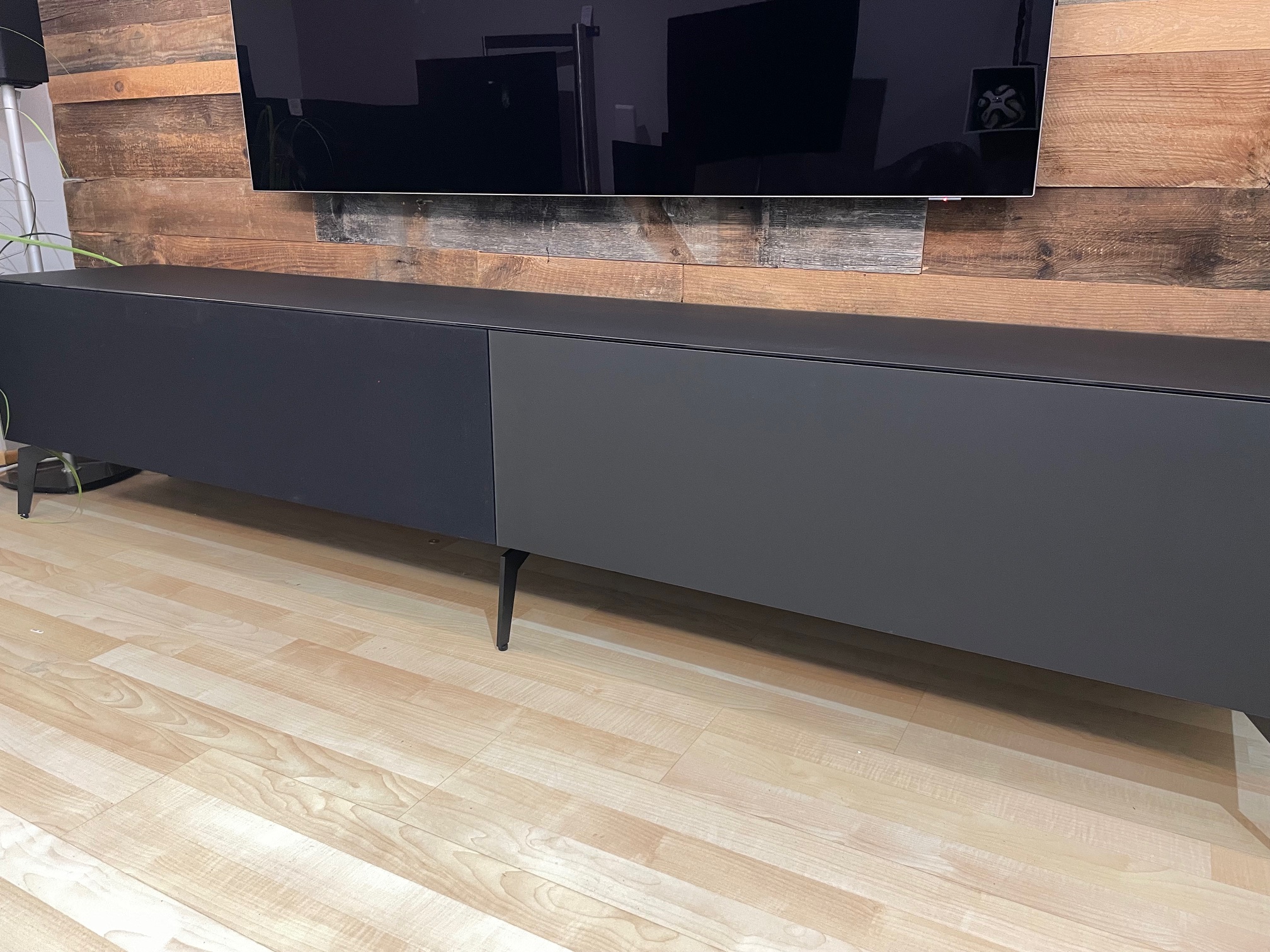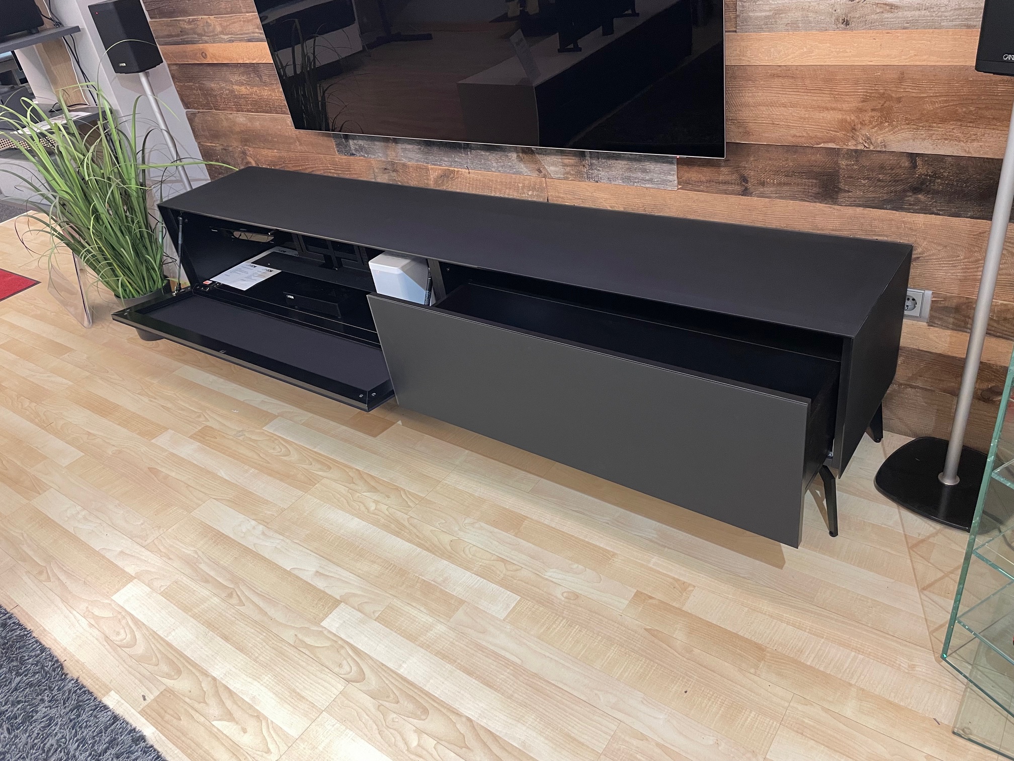 Unsere Ausstellungsstücke sind meist komplett konfiguriert und zur Abholung in unserem Showroom! Der Korpus ist komplett aus seidenmattem Glas gefertigt, während die Akustikstofffront farblich passend zum Gehäuse abgestimmt ist. Das Möbel hat eine Breite von 220 cm und ist ideal auf die Unterbringung einer Soundbar Ihrer Wahl im linken Möbelteil vorbereitet. Darüber hinaus bietet das Monaco-Möbel großzügigen Stauraum für weiteres Zubehör und Peripheriegeräte. Die rechte Seite ist eine Schublade in 100 cm Breite.