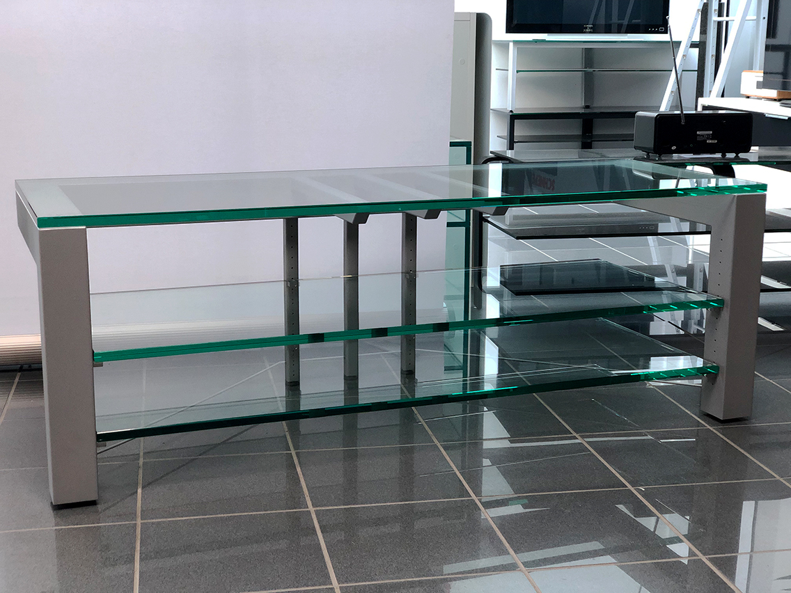 Das TV-Möbel Focus 150 des Herstellers Schroers & Schroers ist ein stabiles und formschönes TV-Regal. Der Rahmen des Fernsehmöbels ist aus Stahl. Schroers verwendet bei diesem Hifi-TV-Möbel im Standard, hochwertiges, 20 mm dickes Klarglas. Durch die verstellbaren Fachböden können Sie so Ihre AV Geräte in der Höhe anpassen. Selbst schwere Receiver oder Verstärker halten die belastbaren Glasplatten aus. Konfigurierbar ist auch ein spezielles Soundglas. Diese Glassorte ist akustisch gedämmt, und verleiht Ihren Geräten einen ausgezeichneten Klang. Ein optionales Lichtsystem verleiht dem Regal zusätzliche, außergewöhnliche Eleganz. Die Topplatte bei diesem Hifi-Möbel ist schwingungsgedämpft gelagert. Das Fernsehmöbel steht stabil auf höhenverstellbaren Tellerfüßen.