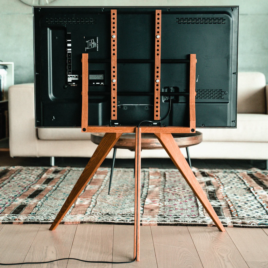 Mit seinen drei Beinen bietet der Fernsehständer Ella die einzigartige Möglichkeit, ihn auch in Ecken der Wohnung zu platzieren, wo alle andere Möbel keinen Platz finden.